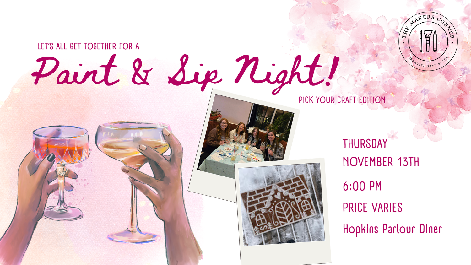 Join us for a cozy Thursday night of creativity and fun at Hopkins Dining Parlour on Thursday, November 13th from 6–8pm!